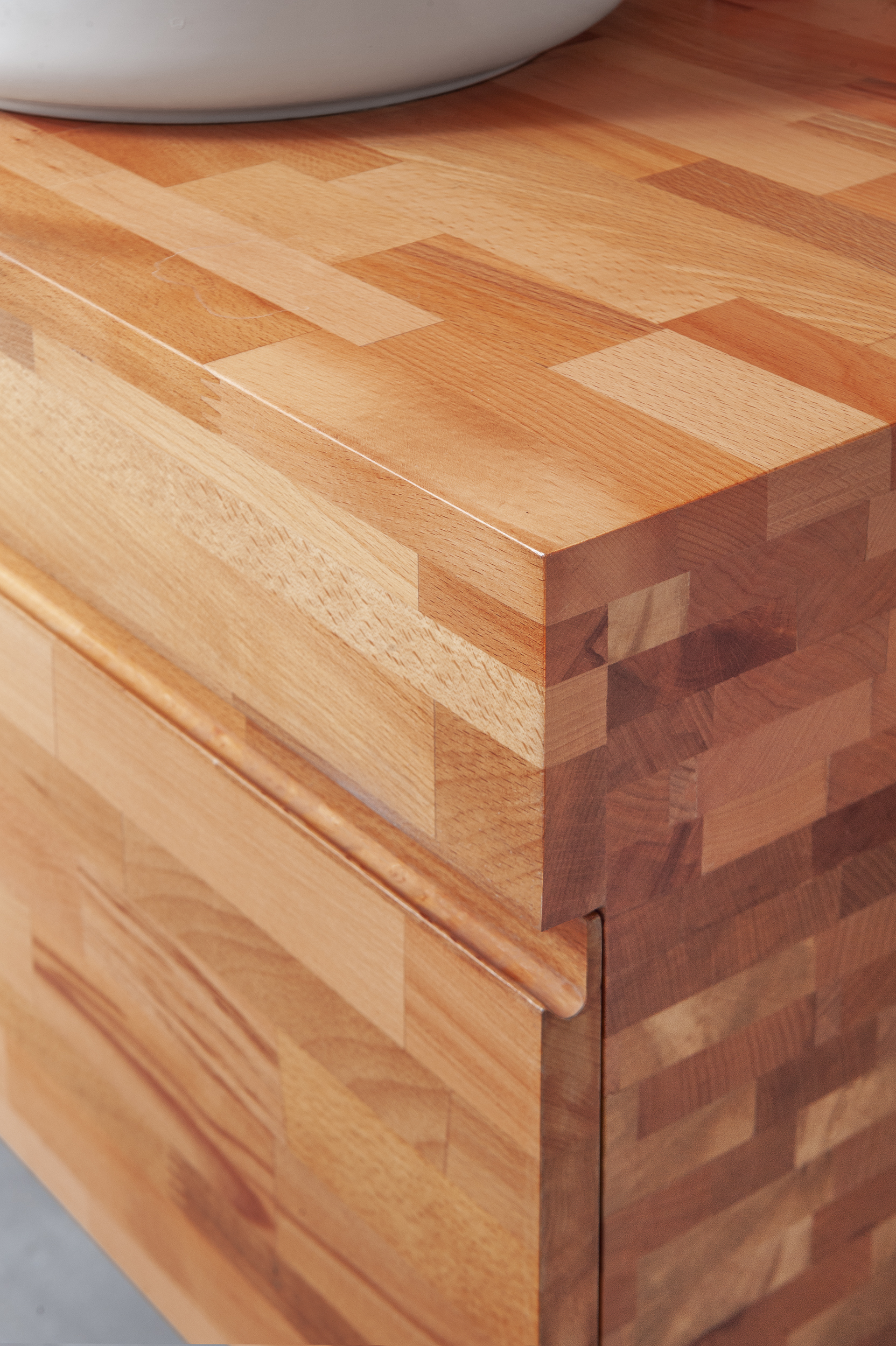 در این نما جزئیات دقیق ساختار چوبی روشویی قابل مشاهده است. قطعات کوچک چوب با ظرافت در کنار یکدیگر چیده شده و به سبک Butcher Block به یک بلوک مستحکم و زیبا تبدیل شده اند. این بافت پر جزئیات علاوه بر استحکام بالا اصالت و کیفیت هنر نجاری را به خوبی نشان می دهد.